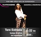 Tere Estrada festeja 30 años de trayectoria se llevará a cabo el jueves 22 de febrero, a las 20:30 horas, en el Teatro de la Ciudad Esperanza Iris (Donceles 36, colonia Centro Histórico, cerca del Metro Allende).